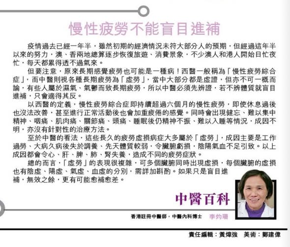 但要注意,原來長期感覺疲勞也可能是一種病!西醫一般稱為「慢性疲勞綜合症」,而中醫則視各種長期疲勞為「虛勞」,當中大部分都是虛證,但亦不可一概而論,有些人屬於濕氣、氣鬱而致長期疲勞,所以中醫必須先辨證,若不辨體質就盲目進補,只會適得其反。