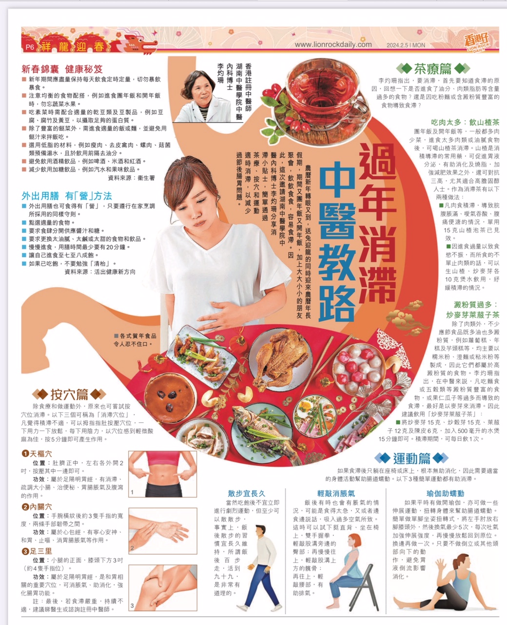 轉眼又到了蛇年歲末,送蛇迎馬的同時,團年飯、開年飯、朋友聚會、夜繽紛……湖南中醫藥大學中醫內科博士李灼珊表示,慶祝新年少不了飲飲食食,所以每年春節假期過後,總會有腸胃不適的病人求醫,建議大家適時消滯,減少過節後腸胃問題。