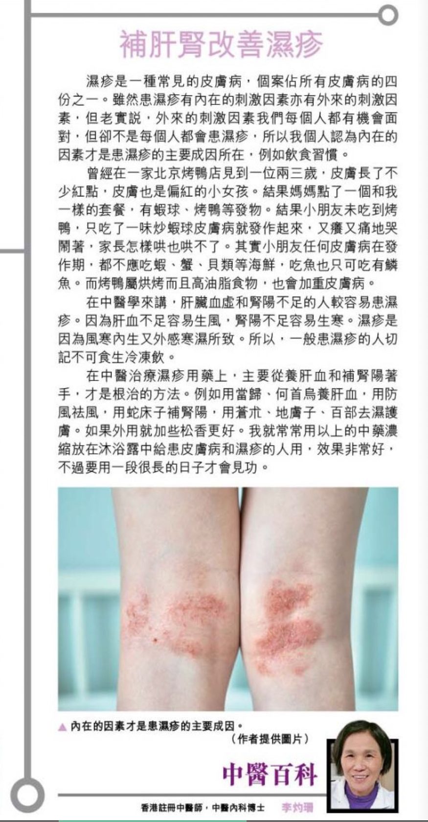 在中醫治療濕疹用藥上,主要從養肝血和補腎陽著手,才是根治的方法。例如用當歸、何首烏養肝血,用防風祛風,用蛇床子補腎陽,用蒼朮、地膚子、百部去濕護膚。如果外用就加些松香更好。我就常常用以上的中藥濃縮放在沐浴露中給患皮膚病和濕疹的人用,效果非常好,不過要用一段很長的日子才會見功。