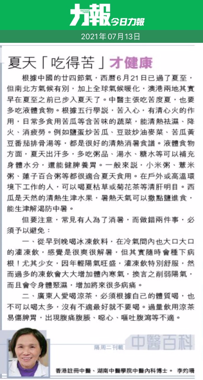 中醫主張吃苦度夏,也要多吃液體食物。根據五行學說,苦入心,有清心火的作用,日常多食用苦瓜等含苦味的蔬菜,能清熱祛濕,降火、消疲勞。例如鹽蛋炒苦瓜,豆豉炒油麥菜,苦瓜黃豆番茄排骨湯等,都是很好的清熱消暑食譜。