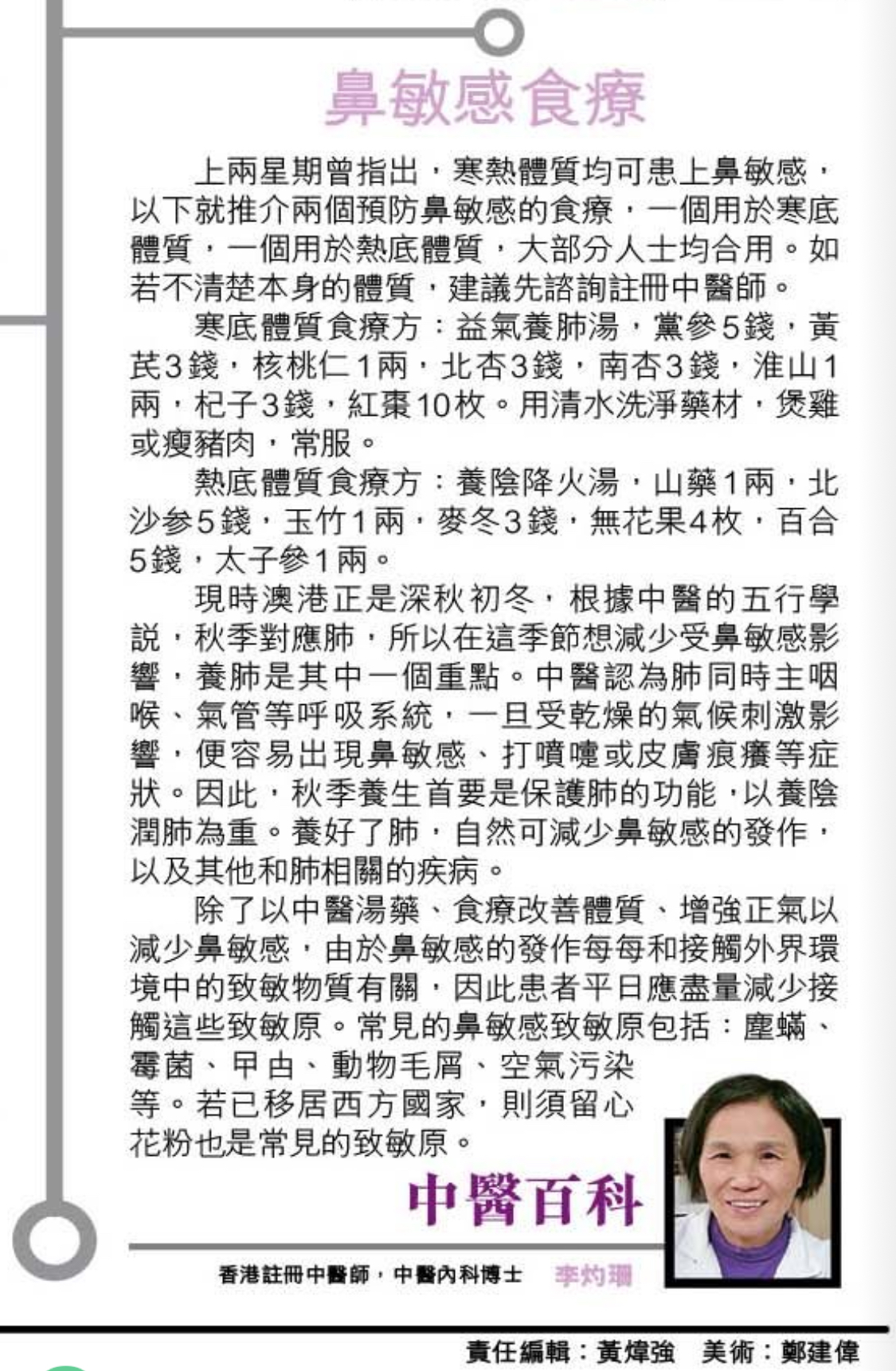 現時澳港正是深秋初冬,根據中醫的五行學說,秋季對應肺,所以在這季節想減少受鼻敏感影響,養肺是其中一個重點。中醫認為肺同時主咽喉、氣管等呼吸系統,一旦受乾燥的氣候刺激影響,便容易出現鼻敏感、打噴嚏或皮膚痕癢等症狀。因此,秋季養生首要是保護肺的功能, 以養陰潤肺為重。養好了肺,自然可減少鼻敏感的發作,以及其他和肺相關的疾病。